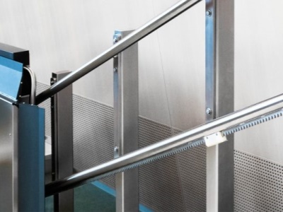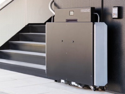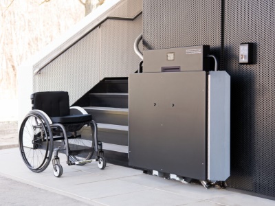 na invalidním vozíku po schodišti. Pohybují se podél kolejnice instalované ze strany